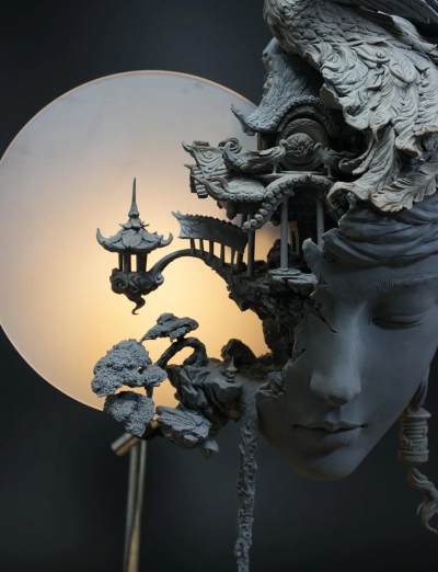 灯光下,一座高度为415毫米的“广寒宫”树脂雕像泛着细腻的光泽——亭台楼阁依月而建,玉兔依偎在嫦娥裙边,水流与松针交织成一片东方幻境。